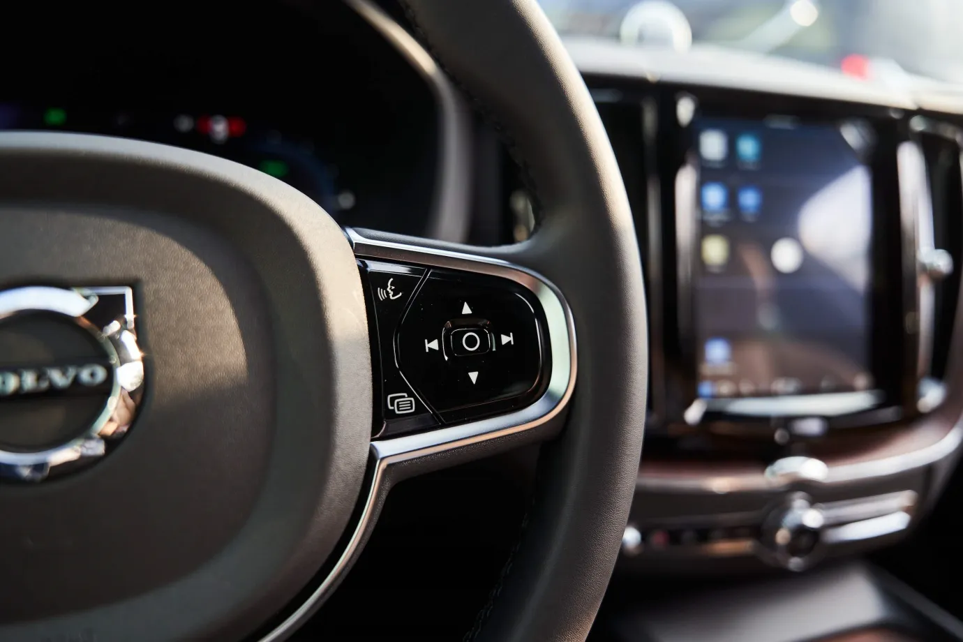 Volvo XC60 Ultra 2025 sử dụng vô lăng 3 chấu bọc da tích hợp nhiều nút bấm tiện lợi màu đen bóng toát lên vẻ cao cấp. Phía sau là bảng đồng hồ kỹ thuật số kích thước 12 inch hiển thị trực quan các thông số vận hành.